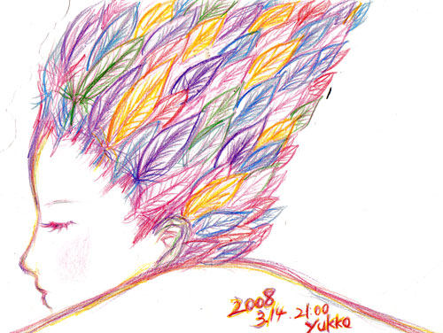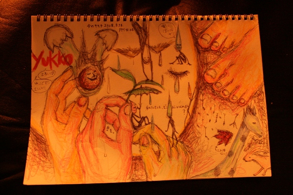最近毎日更新している。 スケッチブックに落書きさせてもらった。 落書きしながら、一時間くらい話してた。「これからのこと」 スケッチブックに 線を、何となく重ねながら、 ずっと、そこに目を落としたまま、 話した。 ちっちゃな本音とか、ちっちゃな何となく思った事とか。 落書きしながら話してた。 ら、これが結構大事な時間になった。 会話すること。ぽろっとつぶやくこと。思うままに線を引くこと。 泣くこと。笑うこと。色とかつけてみること。暗い中。音楽の中。 最近よく考えている事を大分話した。 ボールペンで線を引きながら、そればっか見ながら、 「なんかさー、」 って。 何となく、最初に描いたのは種だった。 最後に書いたのは、10:04 だった。 とても良い、こころの喚起が出来たんだ。 いっぱい酸素を吸い込んだ。 2008.03.11 Tue 15:17:14